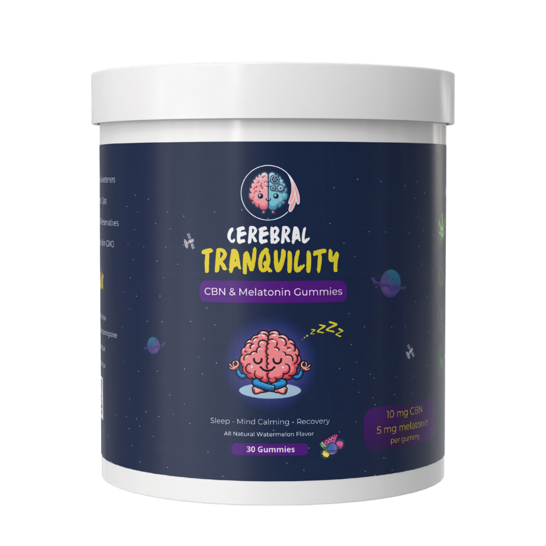 Cerebral Tranquility is our premium watermelon-flavored sleep and migraine support gummy containing a powerful combination of 10 mg CBN (cannabinol) and 5 mg melatonin per gummy. Unlike other sleep products, it addresses multiple aspects of migraine pathophysiology including inflammation, pain signaling, sleep disturbances, and mood instability. The gummies feature natural watermelon flavoring with no artificial colors or preservatives, and are 100% vegan, gluten-free, and non-GMO. Cerebral Tranquility and TorqueGlide are manufactured in an FDA-registered facility under strict cGMP guidelines, ensuring the highest standards of quality, purity, and consistency.